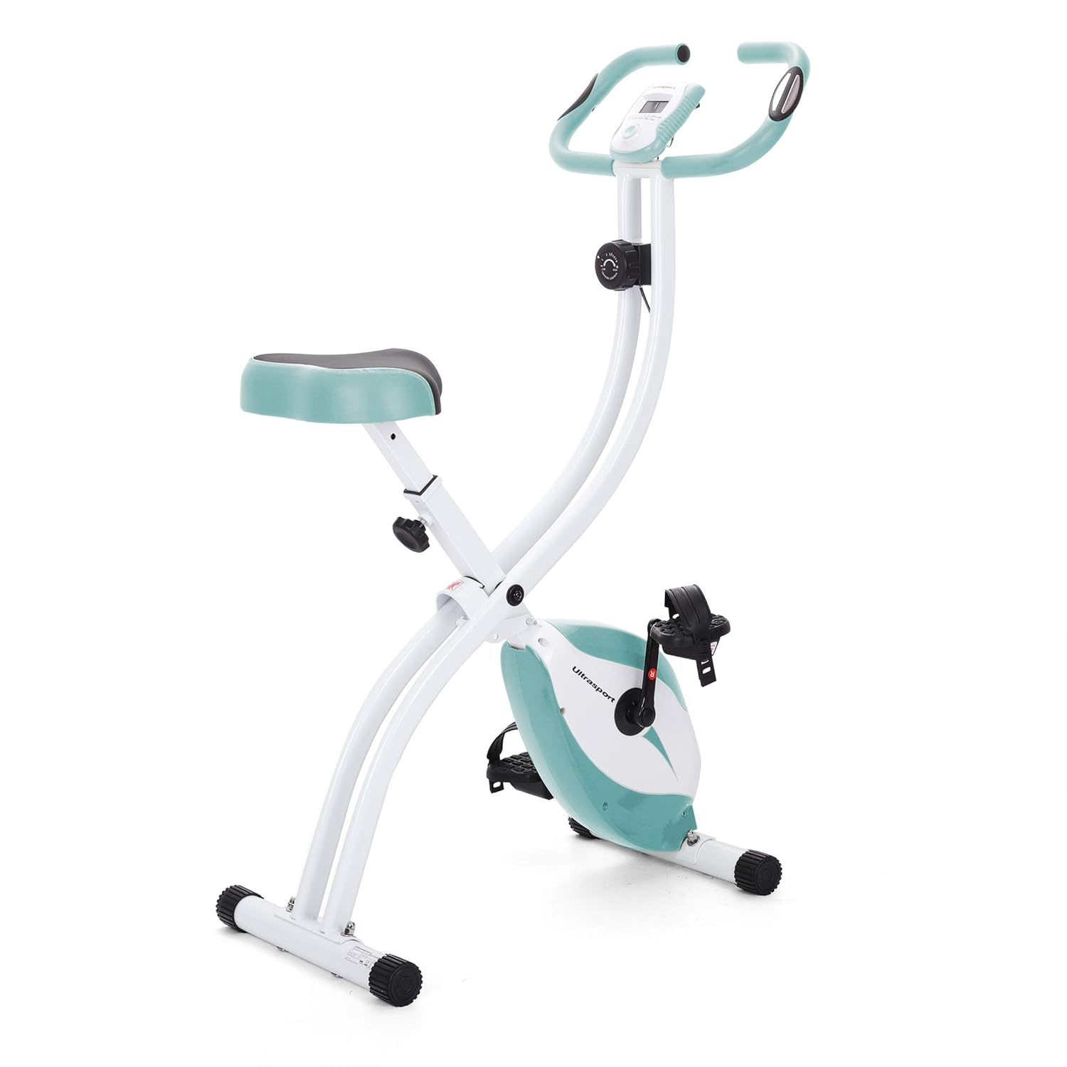 La primera bicicleta es la Ultrasport F-Bike 150, bicicleta estática plegable, aparato doméstico, bicicleta fitness con 8 niveles de resistencia, fácil de montar y de plegar, desarrollado por el líder del mercado de F-Bike Ultrasport. Ahorra mucho espacio gracias al mecanismo de plegado y su diseño curvado. Fortalece el sistema cardiovascular y la musculatura con la ayuda de los 8 niveles de resistencia. Moderna pantalla LCD de pilas (funciones: tiempo, calorías, velocidad, distancia, pulso). Disponible con o sin respaldo; peso máximo del usuario aprox. 100 kg. Además os enseñamos este soporte para vuestro kindle o tablet, de forma que podáis leer, ver una serie o película mientras hacéis ejercicio.