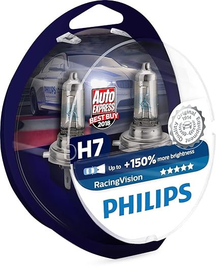 Las segundas bombillas son unas Philips RacingVision, con un 150% más de brillo, cosa que nos permite ver más lejos y mejor, pudiendo reaccionar antes ante cualquier circunstancia que haya en la carretera. El flujo luminoso es 1500l al igual que la anterior, y el set incluye dos bombillas halógenas H7. En caso de querer estas bombillas en H4 también están disponibles aquí, siendo igual es estética y calidad que las H7.