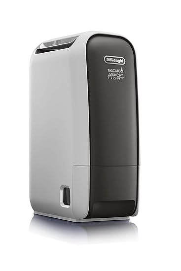 El primer deshumidificador es de De´Longhi, tiene una capacidad de 2,8 litros de depósito, pudiendo almacenar un total de 16 litros a lo largo del día. Este deshumidificador tiene un panel LCD en el que controlas todo, dispone de asas para un transporte más cómodo. Puede purificar el aire con el ionizador y la tecnología zeolite. Tiene 5 niveles de deshumidificación (TURBO, ECO, AUTO, MAX y MIN), además incorpora filtro antipolvo, función secado de ropa e indicador del nivel del agua en el propio depósito al ser este transparente. Dispone de apagado automático si eliges un tiempo determinado en el que funcione. El ruido que emite este deshumidificador es de 34dB.