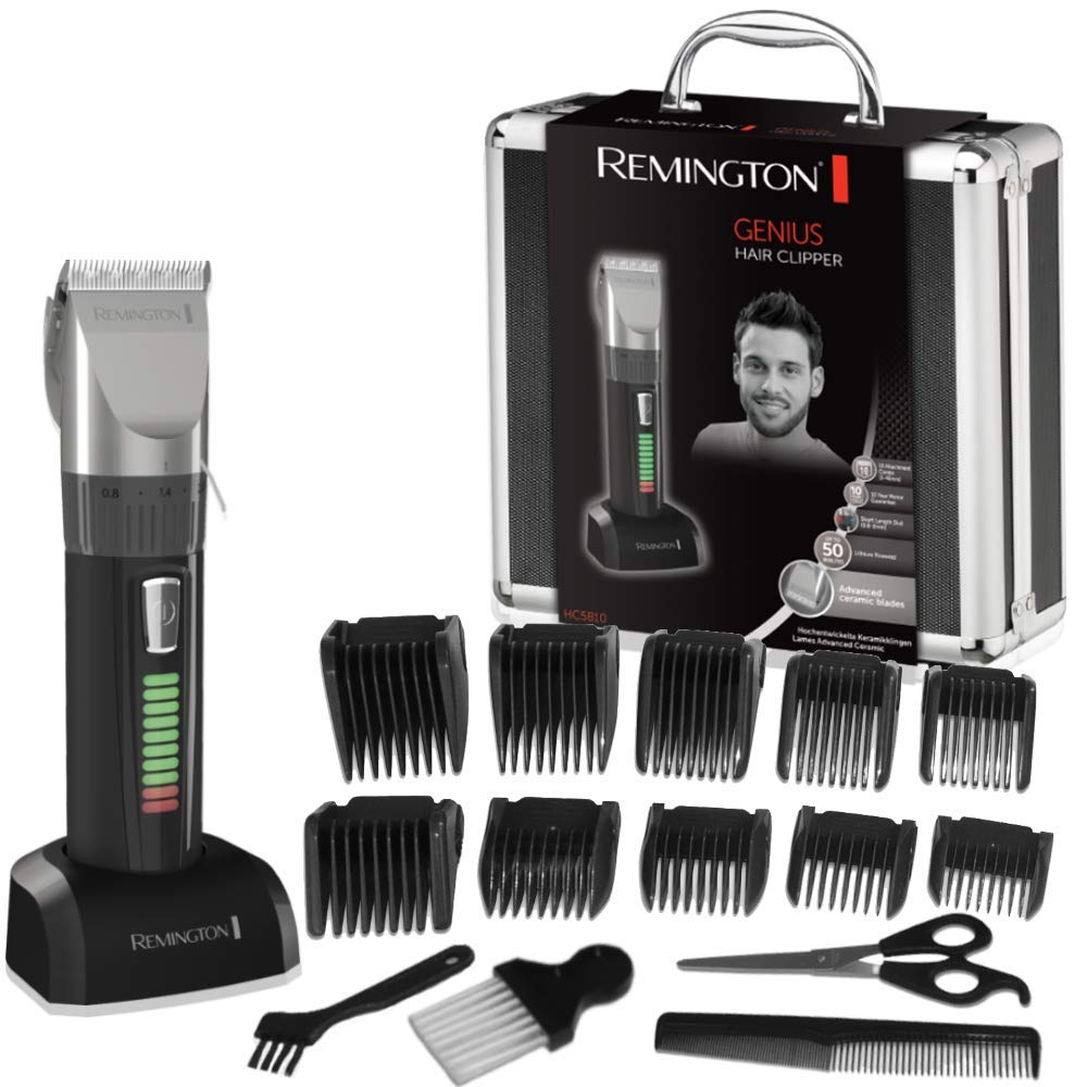 La cuarta recortadora es la Remington Genius HC5810, cuchillas de cerámica avanzada, acabado de goma antideslizante e indicador LED de niveles de carga. Incluye 10 peines guía (3 a 40 mm), tijeras, cepillo para el cuello, peine, cepillo para la limpieza, cabezal de corte preciso (0 8 a 2 mm). Funciona tanto con cable como inalámbrico; hasta 50 minutos de autonomía y tiempo de carga completa de 90 minutos. Cortapelos profesional con Motor Pro Power con potencia de 1400 vatios. Incluye además una botella de aceite, la base de carga y maletín.