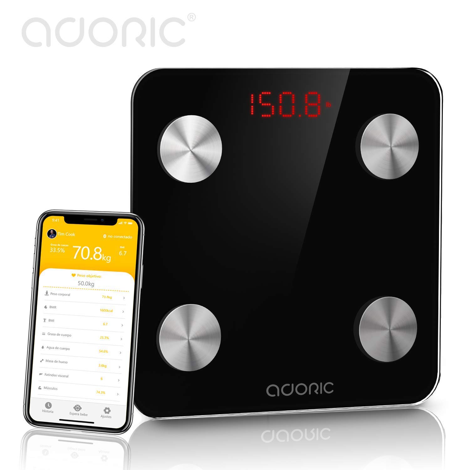 Estas son las 8 medidas esenciales que podrás ver en la app, este ayuda mucho para controlar bien el peso y factores como puede ser controlar la grasa del cuerpo, agua...La app de la báscula se llama, Adoric Health.